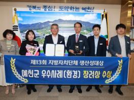 예천군은 지난 2일 행정안전부가 주최하고, 한국생산성본부가 주관한 ‘제13회 전국 지방자치단체 생산성대상’에서 ‘환경분야’ 우수사례로 선정돼 장려상을 수상했다.