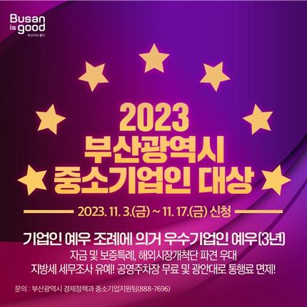 부산시는 오늘(3일)부터 11월 17일까지 ‘2023년 부산광역시 중소기업인 대상’ 후보자를 추천받는다고 밝혔다.