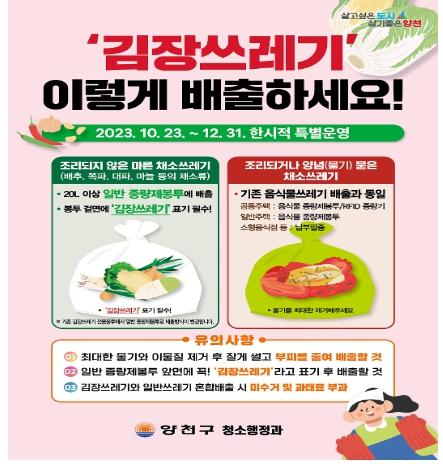 양천구는 김장철을 맞아 일반 종량제봉투(20리터)를 활용한 김장쓰레기 배출을 12월 31일까지 한시적으로 허용한다고 밝혔다.