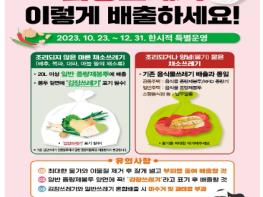 김장쓰레기와 일반쓰레기를 종량제 봉투에 혼합 배출할 경우 수거하지 않고 과태료를 부과한다. 조리되거나 양념, 물기가 묻은 채소 쓰레기는 음식물 종량제봉투나 전파식별(RFID) 종량기, 납부 필증 등을 활용해 배출해야 한다.