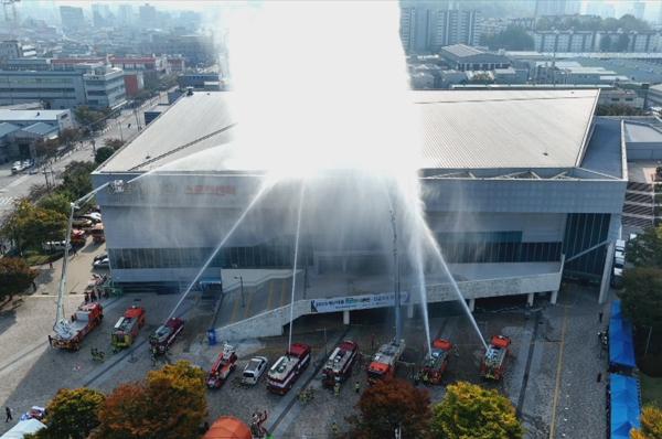 이번 긴급구조종합훈련은 폭발에 의한 다중이용시설 화재 및 붕괴 등 복합 재난사고 상황을 가정해 실시했다.