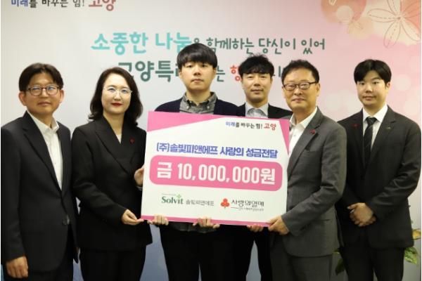 고양특례시는 지난 11월 2일, (주)솔빛피앤에프가 이웃사랑 나눔을 위해 성금 1천만원을 기탁했다고 밝혔다. 후원금은 경기 사회복지공동모금회를 통해 저소득 가정의 중고등학생 장학금과 어르신 생계비 등으로 사용될 예정이다.