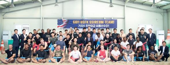 문화재청 공모사업인'국가 무형유산 전승공동체 활성화 지원사업-씨름'을 통해 우리의 전통 민속경기이자 국가 무형유산인 씨름을 배우고 있는 캠프 캐롤 부대 주한미군 장병들이 3일 구미시청 씨름단 연습장 찾아 선수들과 함께 합동 훈련을 했다.