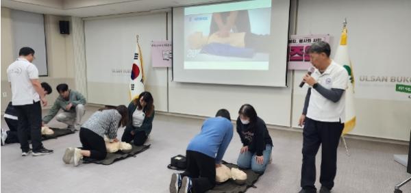 울산 북구청 공무원 20여 명은 4일 구청 다목적실에서 자원봉사 '핸즈온' 활동으로 응급상황에 대비할 수 있는 심폐소생술 훈련 활동을 했다.