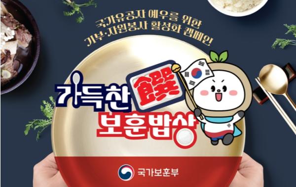 국가보훈부(장관 박민식)는 “국가유공자 예우와 보훈문화 확산을 위해 추진 중인 '가득찬(饌) 보훈밥상' 2호점에 (사)다일복지재단 산하 ‘밥퍼 나눔운동본부’가 참여하기로 하고, 오는 6일 오전 11시, 서울 동대문구 밥퍼 나눔운동본부에서 2호점 개시 행사를 개최한다”고 밝혔다.