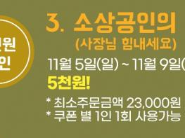 경기도주식회사는 5일 일요일부터 9일 목요일까지 총 15개 지역에서 ‘소상공인의 날 할인 이벤트’를 진행한다고 전했다. 이번 이벤트를 통해 최소 2만 3천 원 이상 주문 시 사용할 수 있는 5천 원 할인 쿠폰을 지급하며 이벤트 기간 중 회원 1인 1회 사용할 수 있다.