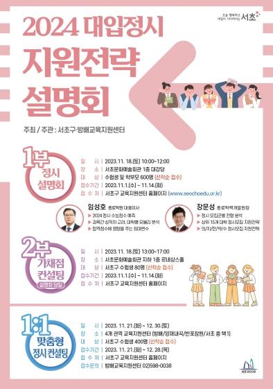 서울 서초구는 18일 오전 10시 양재동 서초문화예술회관에서 고3 수험생과 학부모 등 600명을 대상으로 ‘2024 대입 정시 지원전략 설명회’를 연다.