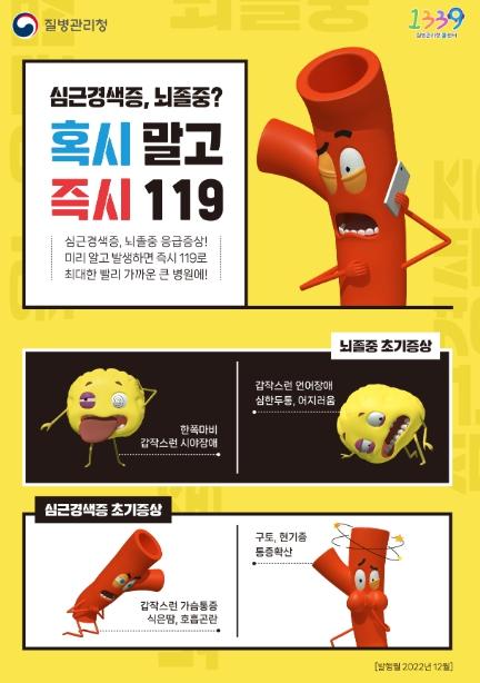 만약 △가슴 통증 △호흡곤란 △식은땀 △구토△현기증 등의 증상이 30분 이상 지속되면 심근경색을, △한쪽 마비 △갑작스러운 언어 및 시각장애 △어지럼증 △심한 두통 등의 증상이 나타나면 뇌졸중을 의심하고 즉시 119에 도움을 요청해야 한다.