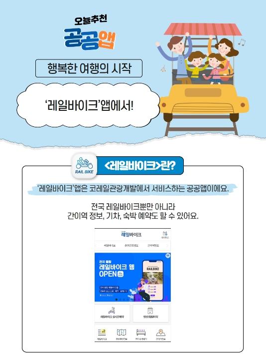 ‘레일바이크’앱은 코레일관광개발에서 서비스하는 공공앱이에요.?전국 레일바이크 조회뿐만 아니라 간이역 정보, 기차, 숙박 예약도 할 수 있어요.