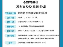 수원박물관이 11월 30일까지 어린이체험실 운영을 도울 자원봉사자 24명을 모집한다.