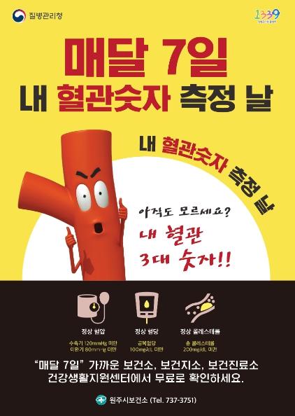원주시보건소는 11월부터 심뇌혈관질환 예방관리를 위하여 “007 내 혈관숫자 측정 날”을 지정·운영한다.