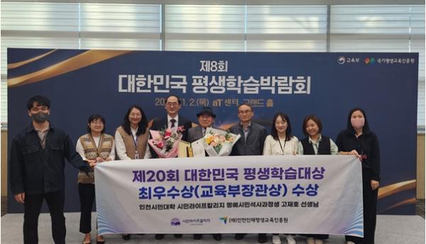 인천인재평생교육진흥원의 인천시민대학 시민라이프칼리지 명예시민석사과정생 고재호님이 '제20회 대한민국 평생학습대상'에서 최우수상(교육부장관상)을 수상했다.
