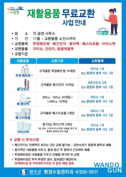 완도군은 올바른 분리배출 문화를 확산시키기 위해 11월 6일부터 연말까지 군민들을 대상으로 ‘재활용품 무료 교환’ 사업을 추진한다.