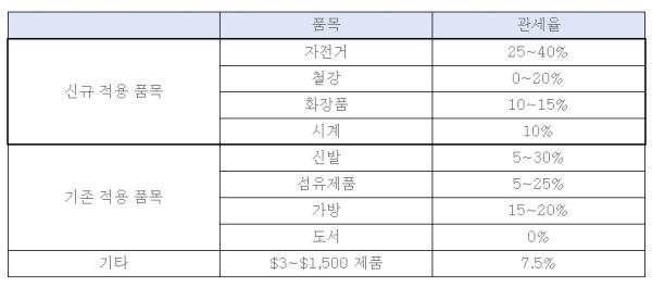 기존 특별 관세 적용 품목은 4가지 품목이였으나 금번 조치로 인해 총 8개 품목으로 적용 범위가 확대된다.