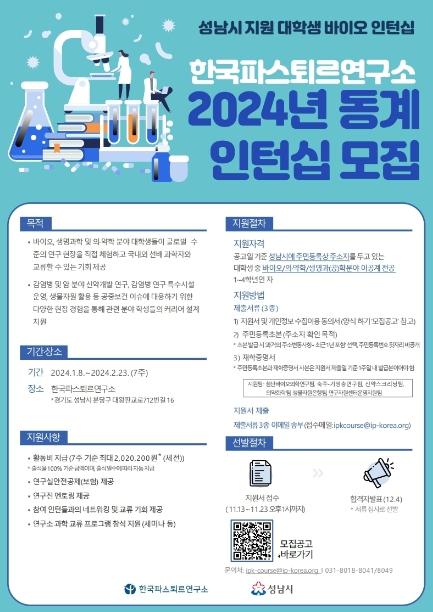 선발되면 2024년 1월 8일부터 2월 23일까지 7주간 분당구 판교테크노밸리 내 한국파스퇴르연구소에서 바이오 관련 현장경험을 쌓게 된다.