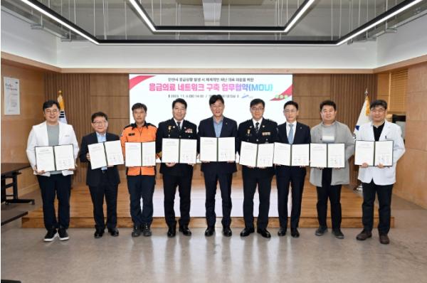 이번 협약은 단원·상록경찰서, 안산소방서 및 관내 5개 응급의료기관(고대안산병원·한도병원·근로복지공단 안산병원·단원병원·사랑의병원)과 신속·적절한 응급의료서비스 제공을 통해 응급환자의 생명과 건강을 보호하고, 지역보건의료 발전을 위해 응급의료 네트워크를 구축 및 운영을 위해 마련됐다.