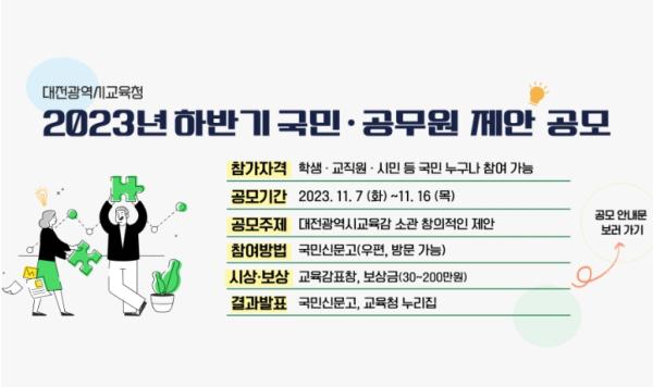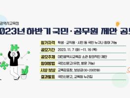 대전광역시교육청은 11월 7일 ~ 16일까지 학생·시민·공무원 등 전 국민을 대상으로 2023년 하반기 국민·공무원 제안 공모를 실시한다고 밝혔다.
