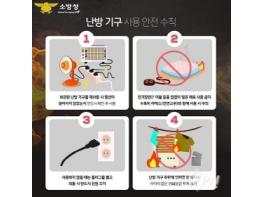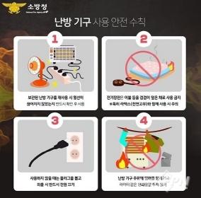난방기구 사용 안전수칙은 전기장판은 이불 등을 겹겹이 덮은 채로 사용 금지, 난방기구 주위에 빨래를 말리거나 라이터 같은 인화물질 두지 않기, 사용하지 않을 때는 플러그를 뽑고 외출 시 반드시 전원 끄기 등이 있다.