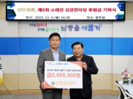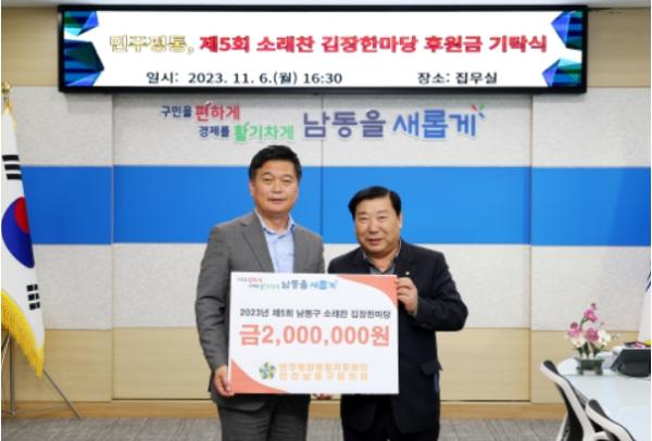 인천시 남동구는 최근 구청장 집무실에서 민주평화통일자문회의 인천남동구협의회로부터 ‘제5회 남동구 소래찬 김장한마당’ 후원금 200만 원을 전달받았다고 7일 밝혔다.
