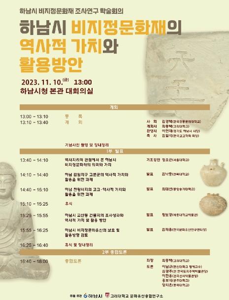 학술회의는 1부 기조강연 ‘역사지리적 관점에서 본 하남시 비지정문화재의 의미와 가치’(정요근 서울대학교 교수)를 시작으로, 주제발표 ▲하남 감일지구 고분군의 역사적 가치와 활용을 위한 과제(김낙중 전북대학교 교수) ▲하남 천왕사지의 고고?역사적 가치와 활용을 위한 과제(최태선 중앙승가대학교 교수) ▲하남시 교산동 건물지의 조사성과와 역사적 가치 및 활용 방안(황보경 세종대학교박물관 학예주임)으로 각 대상 문화재에 대하여 조명하고 ▲‘하남시 비지정문화유산의 보호 및 활용방안 검토’(김재홍 한국문화유산연구센터장) 발표 순서로 진행된다.