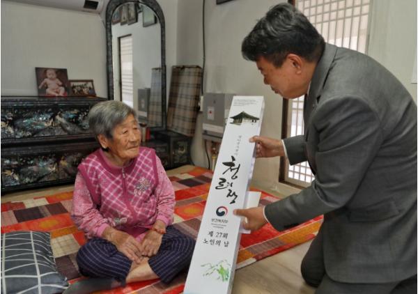 이날 당진시장은 대호지면, 신평면, 고대면에 거주하는 어르신 댁(3가구)에 직접 방문하여 건강과 장수를 상징하는 장수 지팡이를 전달하고 무병장수와 행복을 기원했다,
