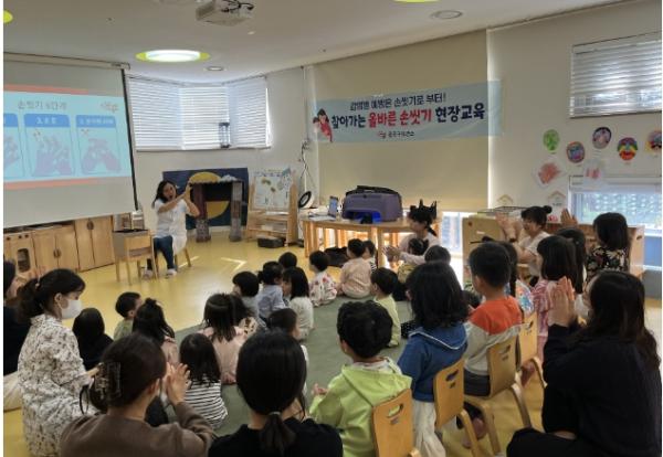 이번 교육은 관내 어린이집, 유치원 12개소로부터 사전 신청을 받아 이뤄졌으며, 감염병 예방효과가 뛰어난 올바른 손씻기법과 기침 예절을 어린이 눈높이에 맞게 알려줘 호응을 얻었다.