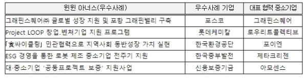 ‘포스코-그래핀스퀘어’, ‘롯데케미칼-로우리트콜렉티브’, ‘한국환경공단-포이엔’, ‘한국중부발전-제타크리젠’, ‘신용보증기금-아모센스’의 대?중소기업 간 함께 성장하는 동반성장 활동 5건이 금년도 첫 번째 ‘윈윈 아너스’로 선정됐다.