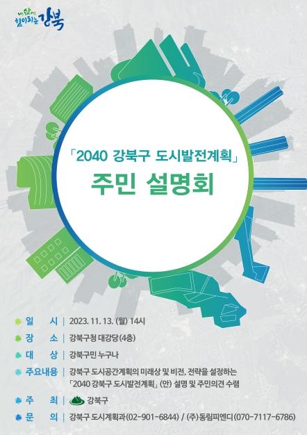 서울 강북구는 오는 13일 오후 2시 구청 4층 대강당에서 ‘2040 강북구 도시발전계획’ 주민설명회를 개최하고, 약 20년간 구의 도시발전을 이끌 목표들을 제시한다.
