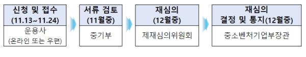 재심의를 희망하는 창업투자회사 및 벤처투자조합의 운용사는 11월 24일까지 신청서와 증빙자료를 제출하면 되며, 자세한 내용은 중소벤처기업부 누리집 공고문을 통해 확인할 수 있다.