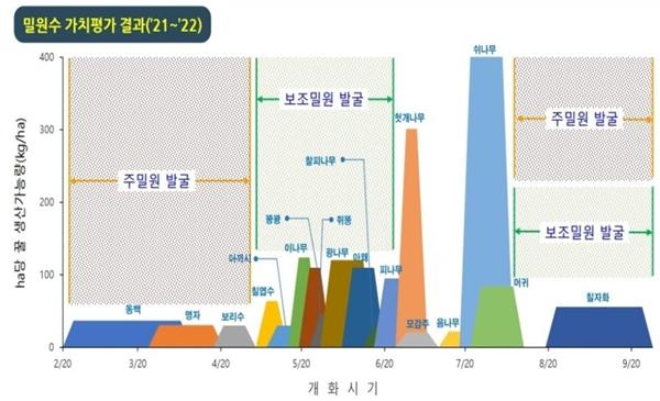 이에 산림과학연구원은 올해 2ha를 춘천 지내리를 시작으로 5개년 계획으로 추진할 예정이며, 다양한 밀원수를 과학적인 측정 방법으로 테스트하여 우수한 화밀량(꿀 생산량)을 보이는 수종을 선정하고, 밀원수 용도의 조림 매뉴얼을 제작할 계획이며, 꿀을 생산할 수 있도록 개화기가 다른 밀원수를 식재함으로써 연중 꿀 생산을 도모할 있도록 할 것이다.