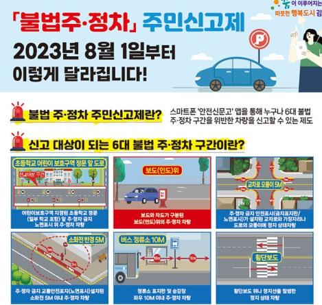 ‘불법주정차 주민신고제’는 공무원의 현장단속이 아닌 일반 시민의 제보를 통해 과태료 부과가 가능한 제도로 ▲횡단보도 위 ▲버스정류장 10m 이내 ▲소화전 반경 5m 이내 ▲교차로 모퉁이 5m 이내 ▲초등학교 정문 앞 도로 ▲인도 ▲기타구역에 대해 2019년부터 단속을 시행중에 있으며, 2023년 9월부터 보행권 확보를 위해 인도에 대한 단속을 확대 실시 중이다.
