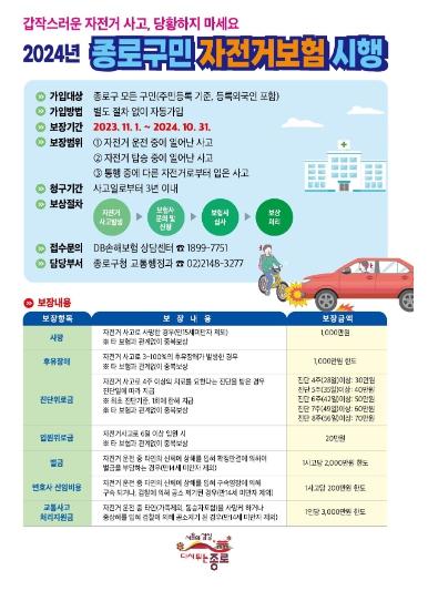 종로구가 자전거 사고 위험으로부터 구민을 보호하기 위해 이달 1일부터 오는 2024년 10월까지 1년간 '종로구민 자전거보험'을 시행한다.