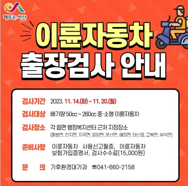 충남 서산시가 14일부터 20일까지 한국교통안전공단과 함께 관내 읍면지역에서 ‘이륜자동차 출장 검사’를 추진한다고 밝혔다.