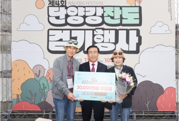 영광의 3만 번째 단양군 디지털 관광주민증 발급자는 서울특별시 구로구에서 온 이병확(남, 60대)씨, 김경신(여, 60대)씨 부부로 ‘제4회 단양강 잔도 걷기 행사’에서 탄생했다.