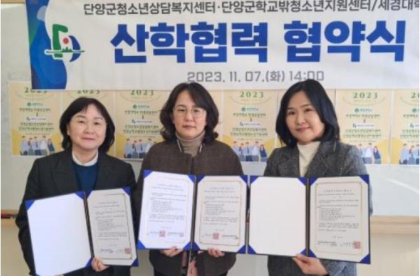 이날 협약식에는 세경대학교 김수림 인재양성부처장(학생상담센터장), 단양군청소년상담복지센터 안승순 팀장, 단양군학교밖청소년지원센터 장정아 팀장 등 기관별 관계자와 실무자들이 참석했다.