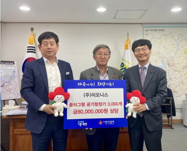 파주시는 8일 ㈜이오니스로부터 지역 내 저소득 노인가구를 위한 플러그형 공기청정기 3,000개를 기탁 받았다고 밝혔다.