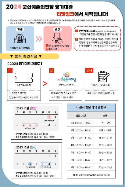 2024년 군산예술의전당 정기대관 예약은 ▲ 공연은 12. 1 10:00 ~ 12. 6 17:00 ▲ 전시는 12. 5 10:00 ~ 12.8 17:00까지 티켓링크 온라인 접속을 통해 신청 가능하다.