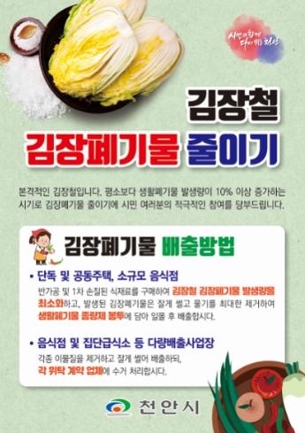 천안시는 김장 쓰레기 분리배출을 위한 홍보 전단지와 현수막을 배부·게시하고 종량제봉투 혼합 배출 여부 등을 점검·집중 단속해 불법 투기 적발 시 100만 원 이하의 과태료를 부과할 예정이다.