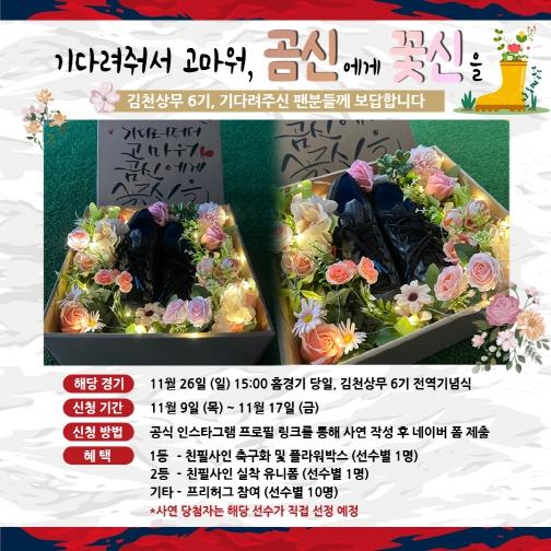 김천상무프로축구단이 9일부터 17일까지 ‘기다려줘서 고마워, 곰신에게 꽃신을’ 사전 사연 신청을 모집한다. ‘곰신에게 꽃신을’ 이벤트는 김천 6기 10명의 전역기념식이 진행되는 11월 26일 홈경기에서 실시할 예정이다.