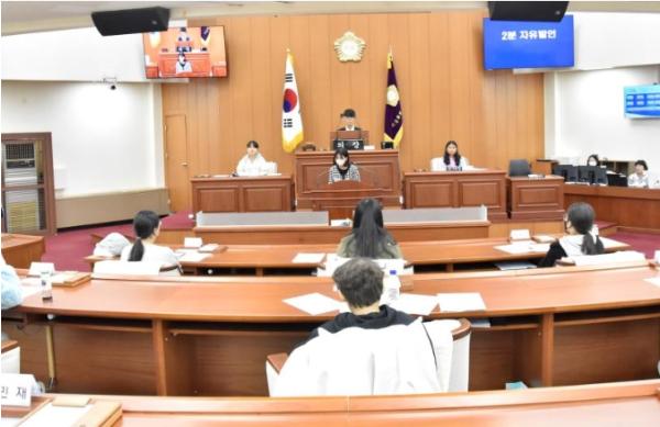 양천구의회는 지난 9일 오전 양천구의회에서 ‘2023년 어린이?청소년 모의의회’를 개최했다. 양천구신월청소년 문화센터에서 청소년 참여위원회 위원으로 활동하고 있는 12명의 청소년들이 일일 구의원이 되어 안건 발의부터 의결, 2분 자유발언까지 다양한 의정활동 체험 프로그램에 참여했다.