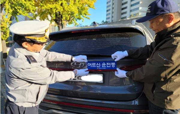 대전서부경찰서는 교통약자인 어르신 교통사고 예방을 위해 65세 이상 고령운전자 차량에 부착하는 표지규격이 통일된‘어르신 운전중’스티커를 제작하여 홍보활동에 나섰다.