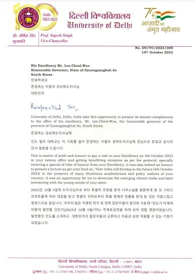 델리대학교와 경상북도의 인연은 지난 5월부터 시작됐다. 이철우 경북도지사가 5월 델리대를 방문해 ‘한국의 꿈, 더 많은 기회, 더 좋은 환경’이라는 주제의 특강과 유학생 유치설명회를 개최해 델리대 학생들의 경북진출에 큰 관심을 끌어낸 일을 계기로 싱 부총장이 지난 10월, 경북도를 방문했다. 이후 델리로 돌아간 싱 부총장이 감사 서한문을 보내온 것이다.