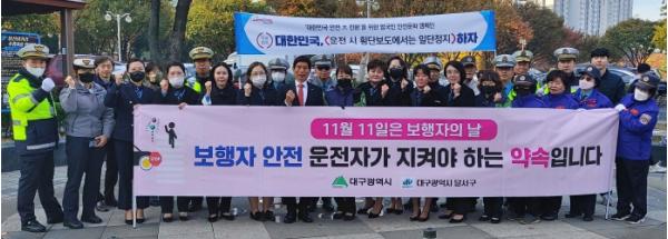 대구 달서구는 9일 아침 용산네거리 일대에서 교통안전봉사단체 40여명이 참여한'보행자의 날(11. 11.)'맞이 교통안전 캠페인을 실시했다.