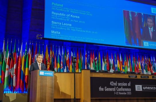 박 장관은 유네스코 총회 기조연설에서 국제 협력을 촉진하여 국제 평화를 증진한다는 유네스코의 임무를 상기하면서, 이스라엘-하마스 분쟁으로 인한 인도적 위기가 조속히 완화되기를 희망했다.