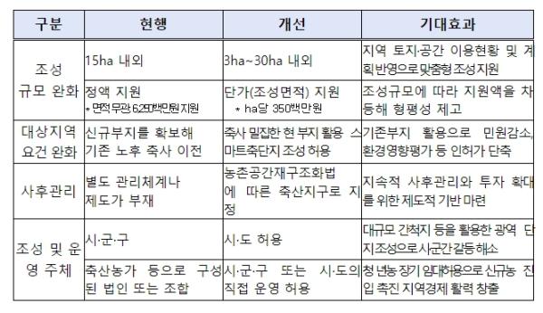주요개편 내용은 다음과 같다. 먼저 지능형(스마트)축산단지 조성규모를 15ha 내외에서 3ha 이상으로 완화하여 농촌지역 토지이용현황과 공간활용 계획 등을 적극 반영할 수 있도록 했다. 이를 통해 조성사업의 주체인 시·군은 활용가치가 높지 않은 외곽지역 3ha 규모의 협소한 토지 등도 사업부지로 활용할 수 있게 됐다.