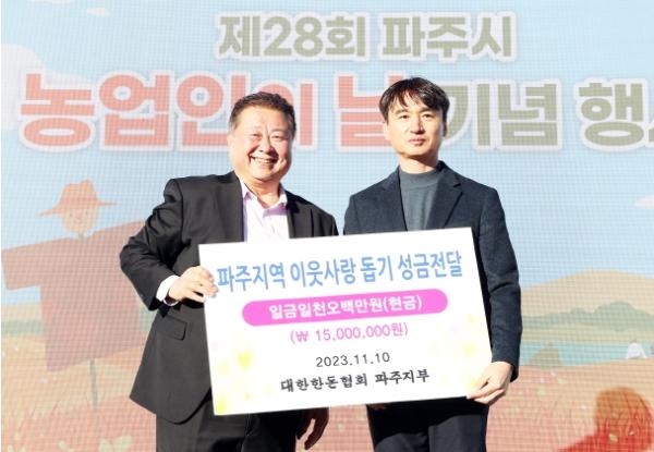 장단콩웰빙마루에서 개최된 농업인의 날 기념행사 후 열린 전달식에는 민승호 대한한돈협회 파주지부장을 비롯한 관계자 등이 참석했다. 대한한돈협회 파주지부는 제28회 농업인의 날(11.11)을 맞아 어려운 이웃을 위해 성금 기탁을 결정했다며, 성금은 파주시 관내 저소득층을 위해 써달라는 뜻을 전했다.