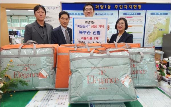 북구 화명1동 행정복지센터는 지난 6일 북부산 신협 수정본점에서 어려운 이웃들이 따뜻한 겨울을 보낼 수 있도록 겨울 이불 7채를 전달했다고 밝혔다.