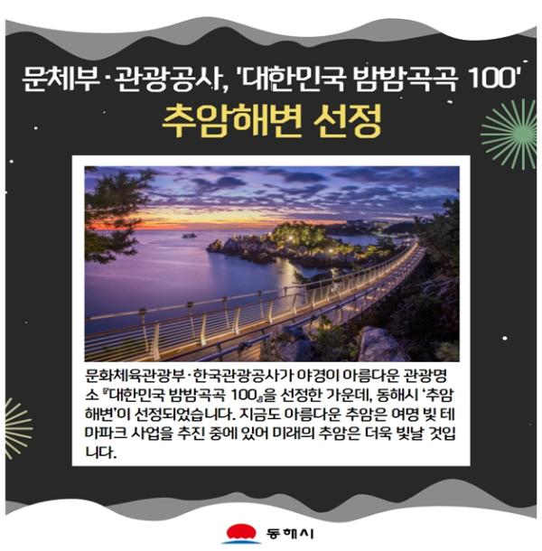 밤이 더 아름다운 야간관광 ‘대한민국 밤밤곡곡 100선’에 동해 추암해변이 선정되어 관심을 끌고 있다.