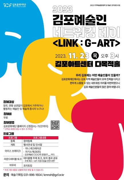 'LINK : G-ART'(링크 지아트)는 김포문화재단의 2023 지역예술활동협력 및 예술인 권익증진사업 일환으로 지역 예술인들의 활동을 격려하고, 서로의 경험과 생각을 공유함으로써 예술활동에 대한 시야를 넓힐 수 있는 소통의 장을 마련하기 위해 준비된 예술인 네트워킹 프로그램이다.