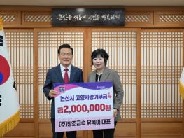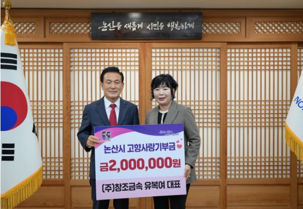 충북 옥천에 소재한 자동차 부품 제조업체 ㈜창조금속의 유복여 대표가 지난 9일 논산시청을 찾아 ‘고향사랑기부금’ 200만 원을 전달했다.
